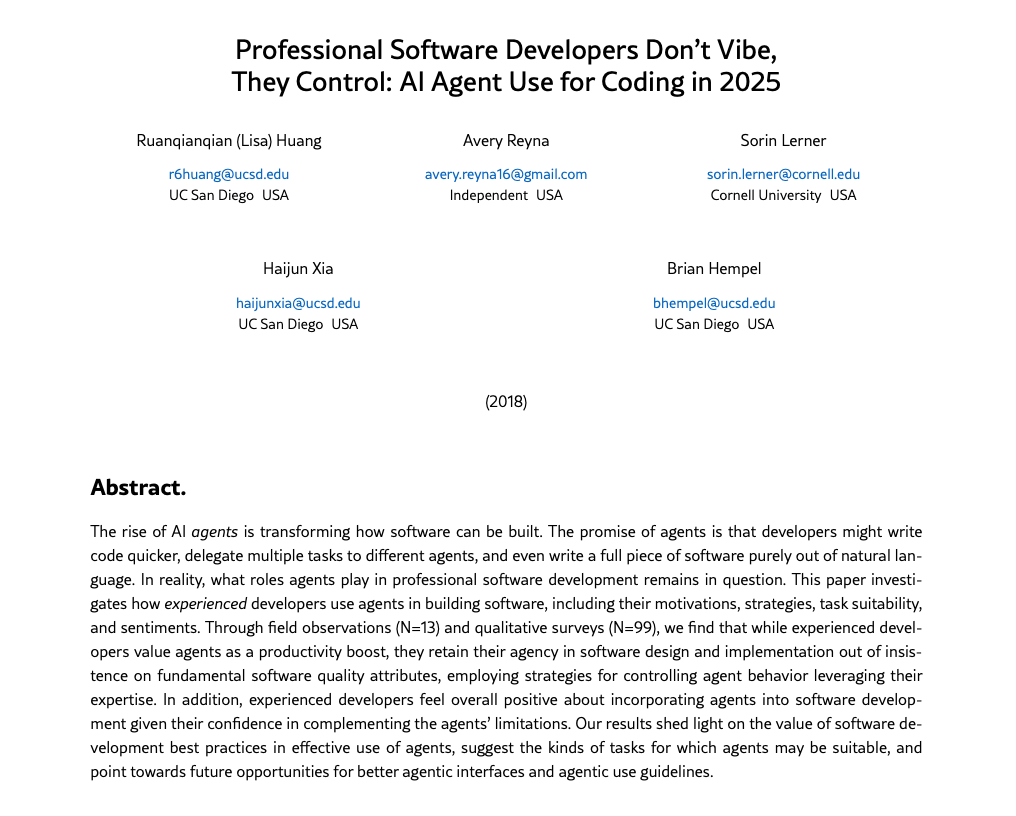 경력 3년 이상 개발자 112명을 대상으로 한 AI 에이전트 사용 패턴 연구. 전문가들은 Vibe Coding 대신 철저한 통제 전략을 사용합니다.