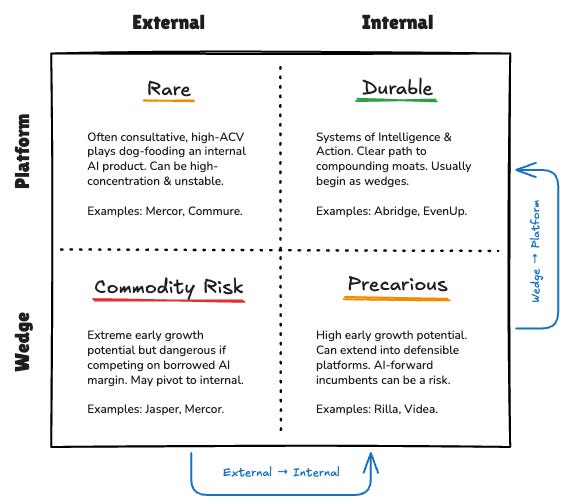 Euclid는 Vertical AI 스타트업을 두 축 — Internal/External, 웻지/플랫폼 — 으로 나눠 4개의 사분면으로 분류합니다. 생존 가능성이 가장 높은 곳은 Internal 플랫폼으로 진화한 기업들이고, 가장 위험한 곳은 External 웻지에 머물러 있는 곳, 즉 낮은 가격을 유일한 무기로 삼는 곳입니다.