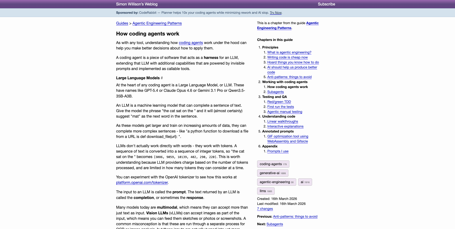 Simon Willison이 연재 중인 “에이전틱 엔지니어링 패턴” 가이드에서 코딩 에이전트의 내부 구조를 체계적으로 설명했습니다. LLM을 매일 쓰는 개발자라면 한 번쯤 짚어둘 만한 내용입니다.