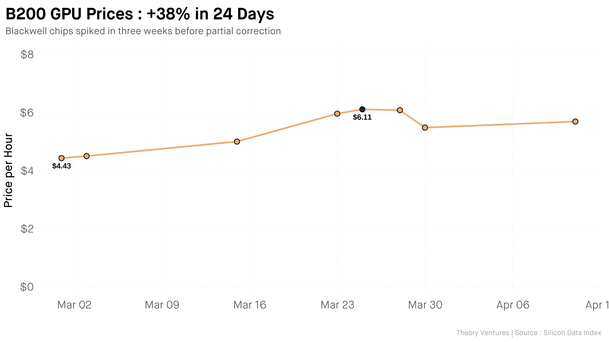 Theory Ventures의 GP 톰 텅구즈(Tom Tunguz)가 현재 AI 컴퓨트 공급 위기를 짧고 명확하게 분석한 글을 발표했습니다. Nvidia Blackwell(B200) GPU 임대 가격이 2개월 만에 시간당 2.75달러에서 4.08달러로 48% 급등했고, 최신 AI 모델에 대한 접근이 제한되기 시작했다는 것이 핵심입니다.