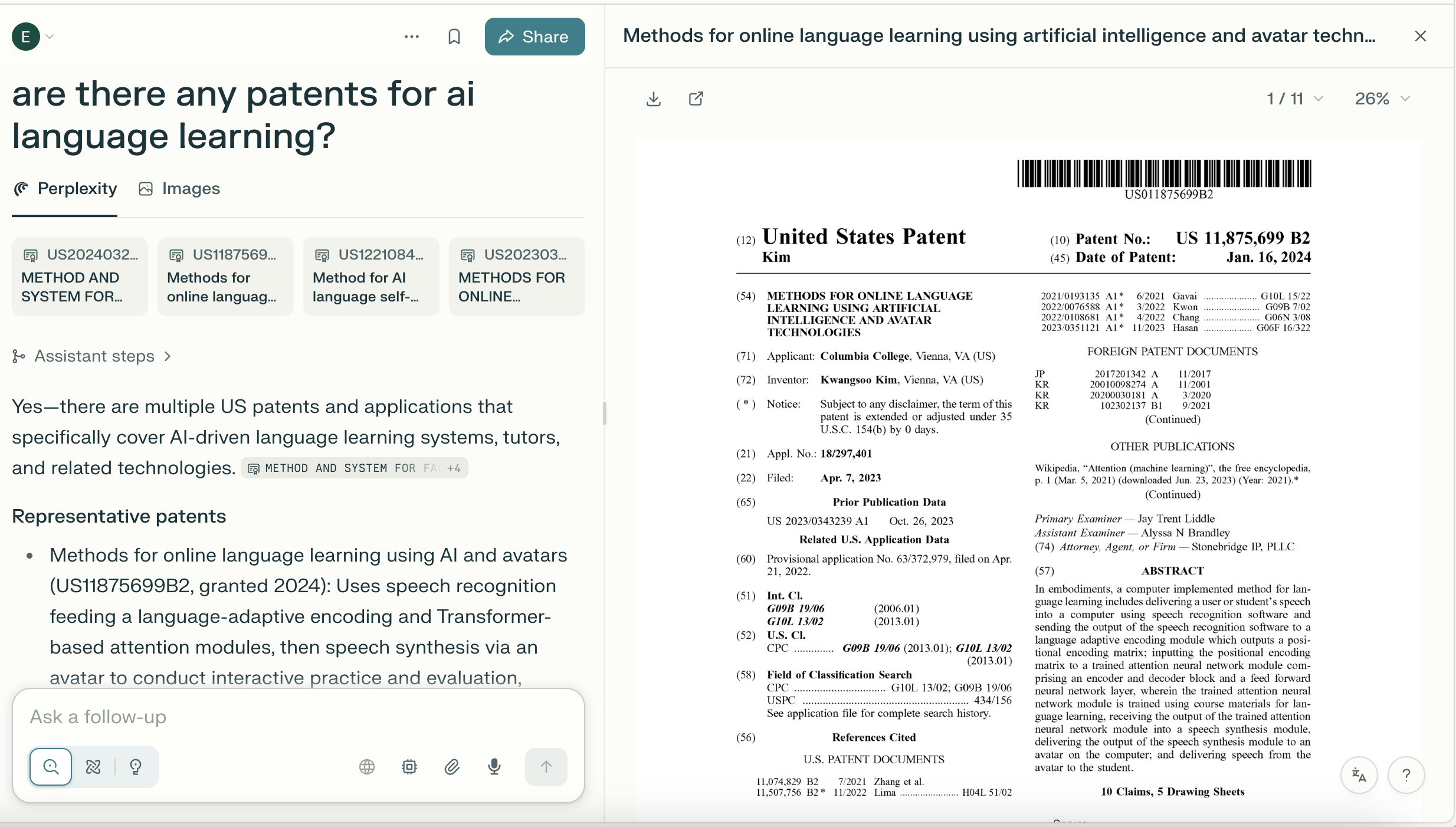 Perplexity가 새로 출시한 특허 검색 도구는 이 문제를 정면으로 해결합니다. “AI 언어 학습 특허가 있나요?” 또는 “2024년 이후 주요 양자컴퓨팅 특허”처럼 일상 언어로 물으면 관련 특허를 찾아주고, 각 특허에 대한 AI 요약까지 제공하죠.