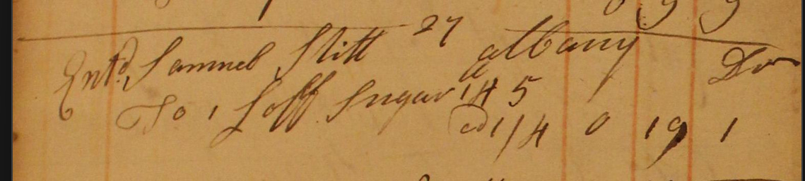 1758년 Albany 상인 장부의 설탕 구매 기록