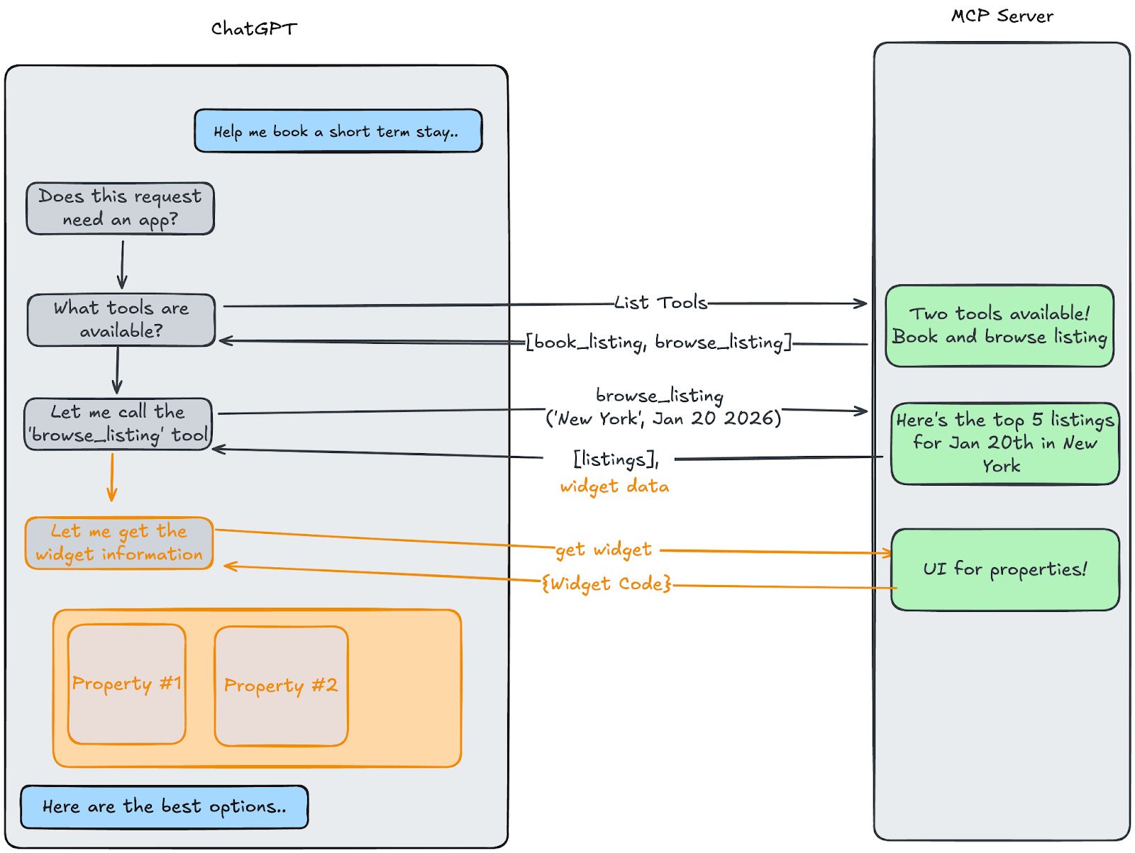 작동 흐름은 이렇습니다. 사용자가 “브루클린에서 이탈리안 레스토랑 찾아줘”라고 하면, ChatGPT는 먼저 MCP 서버에 어떤 도구들이 있는지 물어봅니다. browse_listingbook_listing 같은 도구를 발견하면 적절한 도구를 선택해서 호출하죠. 서버는 데이터를 돌려주고, 동시에 어떤 UI 컴포넌트를 보여줄지도 알려줍니다. ChatGPT는 그 컴포넌트 코드를 가져와서 대화창에 렌더링합니다.