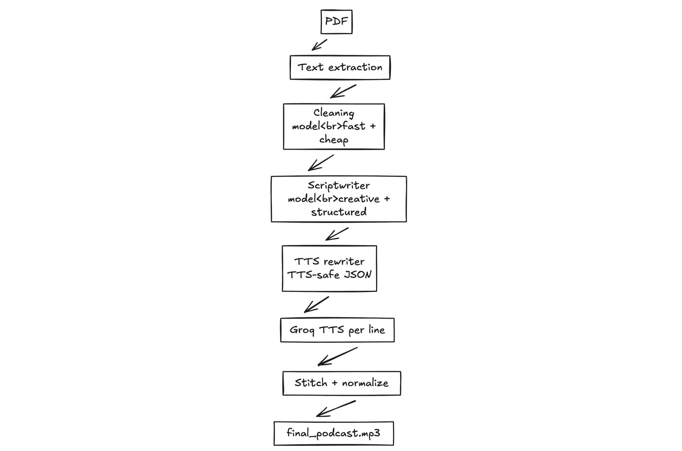 Groq의 PlayAI-TTS를 사용해 각 대사를 음성으로 변환합니다. Speaker 1과 2에 서로 다른 목소리(Fritz, Arista)를 할당하고, 생성된 오디오 세그먼트를 순서대로 이어붙여 하나의 MP3 파일을 만듭니다.