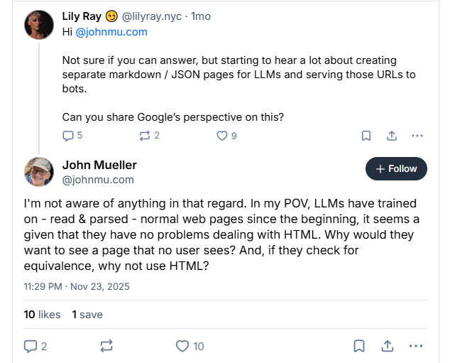 하지만 Google의 John Mueller는 이 접근법에 회의적입니다. “LLM은 처음부터 일반 웹페이지를 학습하고 파싱해왔습니다. 왜 사용자가 보지 않는 페이지를 보고 싶어 하겠어요?” 그는 LLM 전용 페이지를 오래전 사라진 keywords meta tag에 비유했습니다. 누구나 쓸 수 있지만, 실제로는 무시되는 기술이라는 거죠.