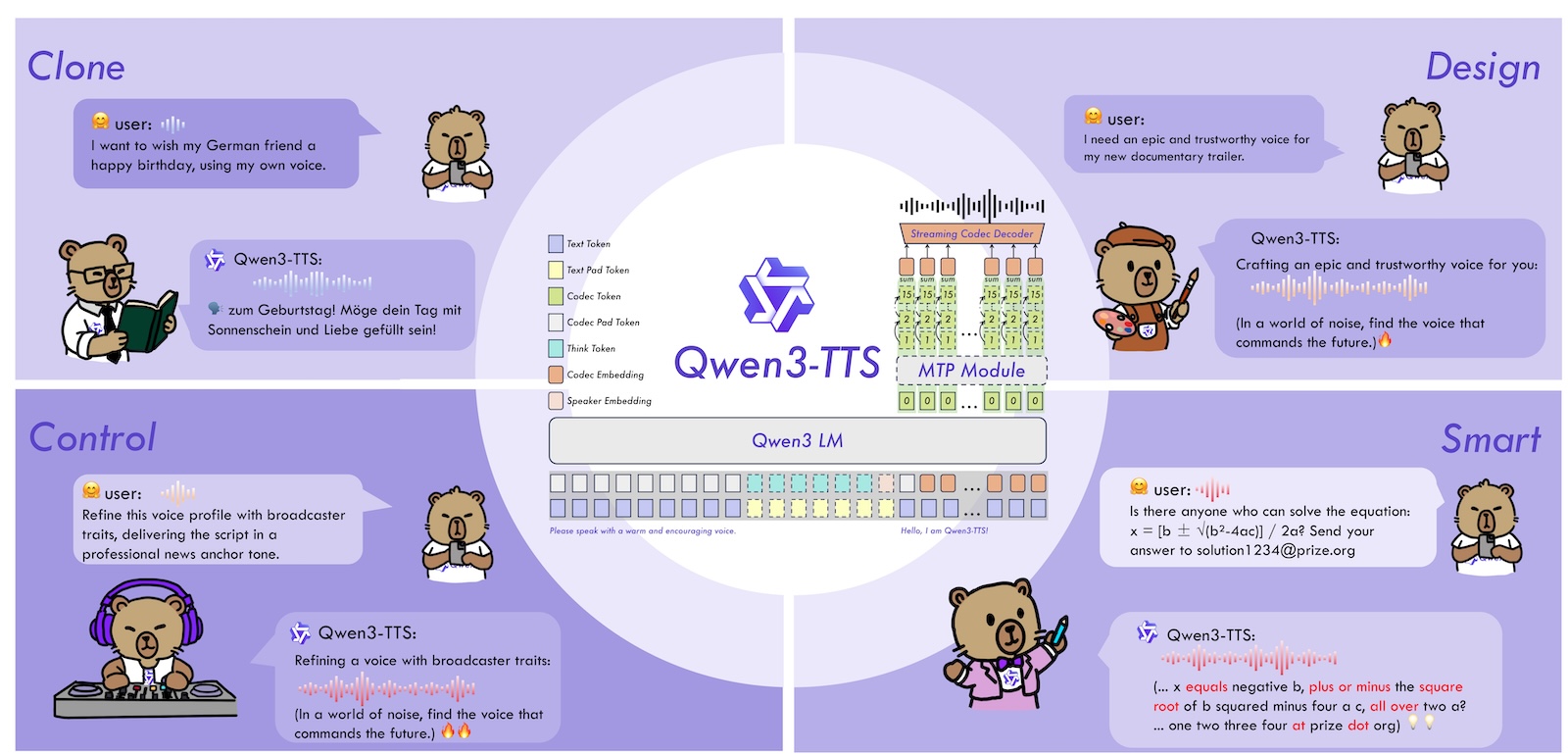 Alibaba Cloud의 Qwen 팀이 1월 22일 공개한 Qwen3-TTS는 단 3초의 음성 샘플로 목소리를 복제하고, 97ms 만에 첫 음성을 출력하는 초저지연 TTS(Text-to-Speech) 모델입니다. 10개 언어를 지원하며 10분 이상의 긴 음성도 안정적으로 생성할 수 있죠. Apache 2.0 라이선스로 모델과 토크나이저가 모두 공개되었습니다.