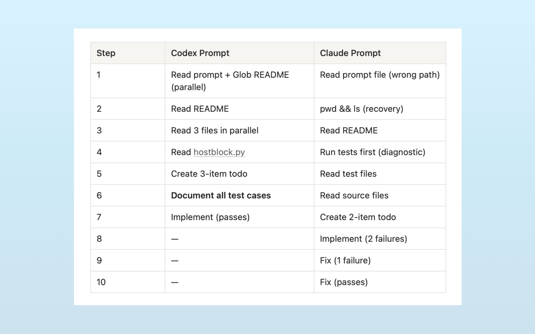 SWE-Bench Pro 문제를 풀게 했더니 작업 방식이 처음부터 갈렸습니다. Codex 프롬프트를 쓴 에이전트는 문서를 철저히 읽고 이해한 뒤 한 번에 구현했습니다. 반면 Claude 프롬프트를 쓴 에이전트는 일단 뭔가 시도하고, 에러를 보고, 고치는 반복적 접근을 택했죠.